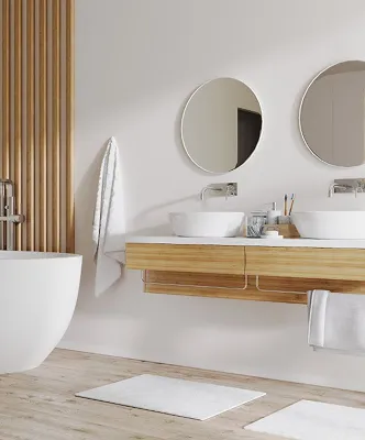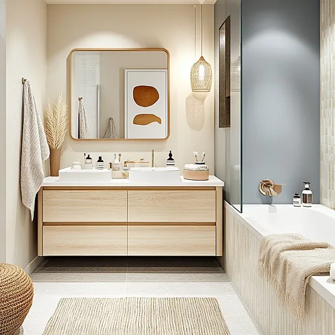 A clean and modern space with smart storage and sleek fixtures for everyday luxury.